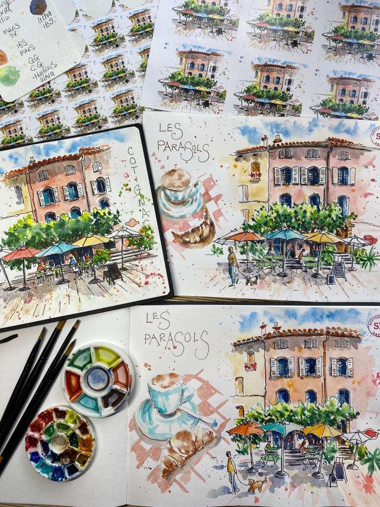 I have worked with Etchr for several years now and the classes that I do with them are based on my sketchbook work, the layout, the colours, the subjects that I choose. We always have fun and we finish up with a lively, interesting page from the villages around where I live in France.