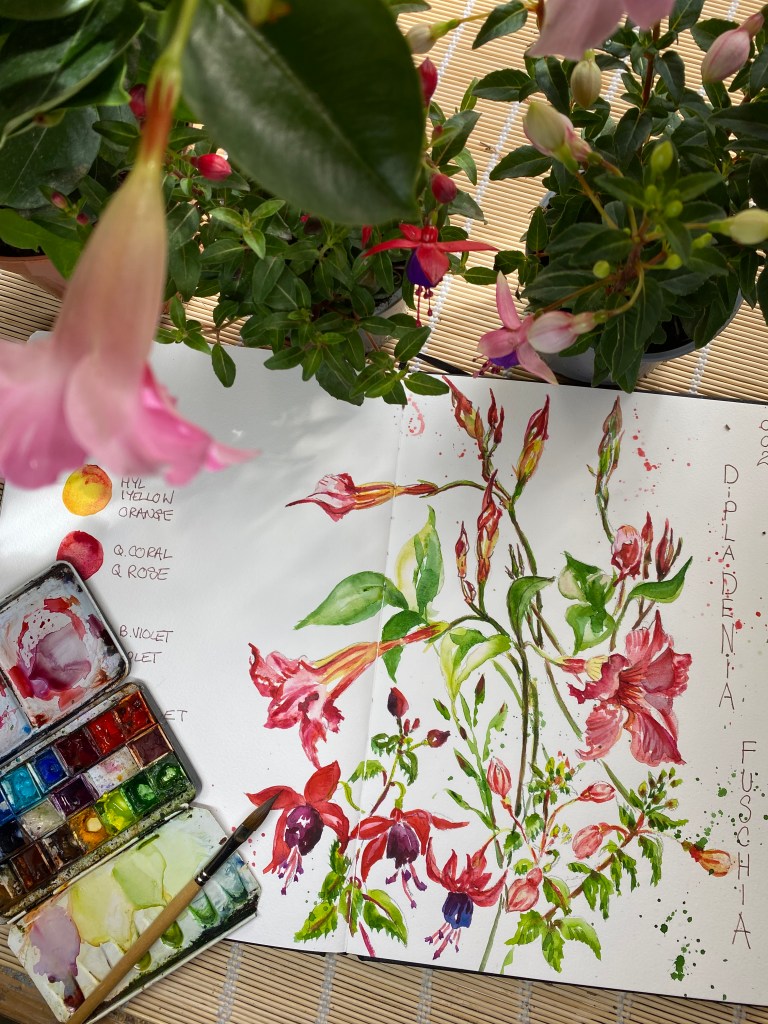Dipladenia, fuchsia, scented garden roses, lilac, all there waiting for me to paint them!
