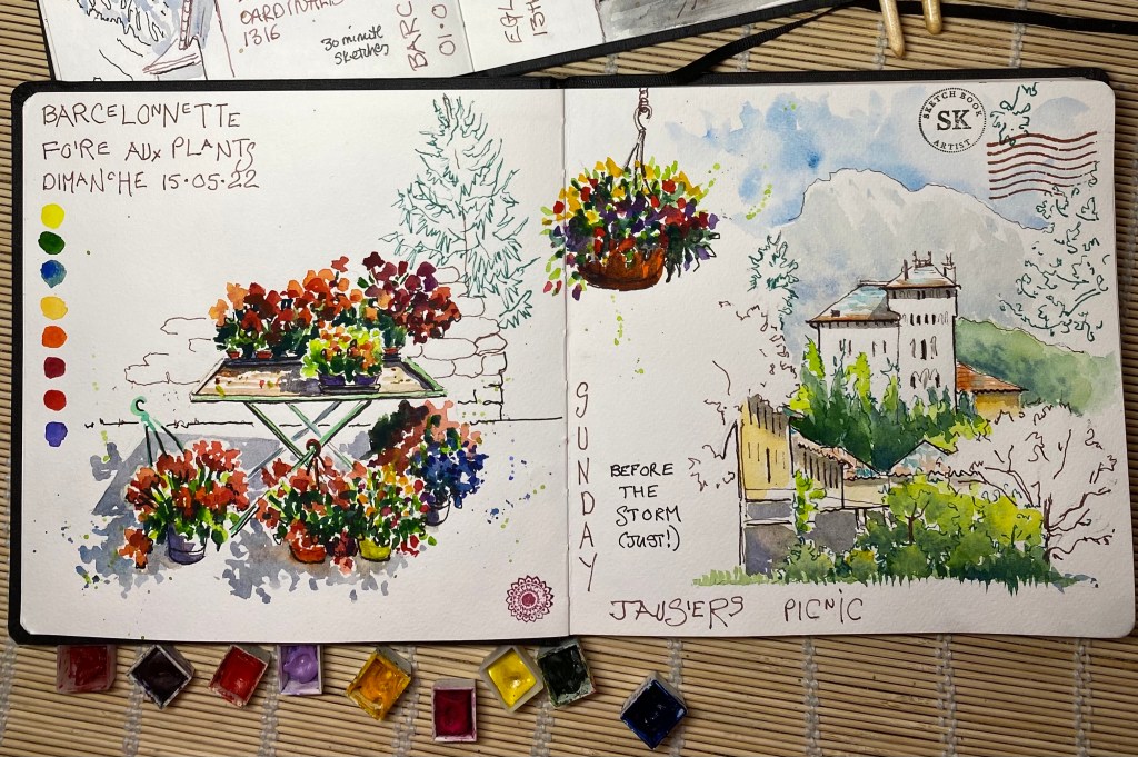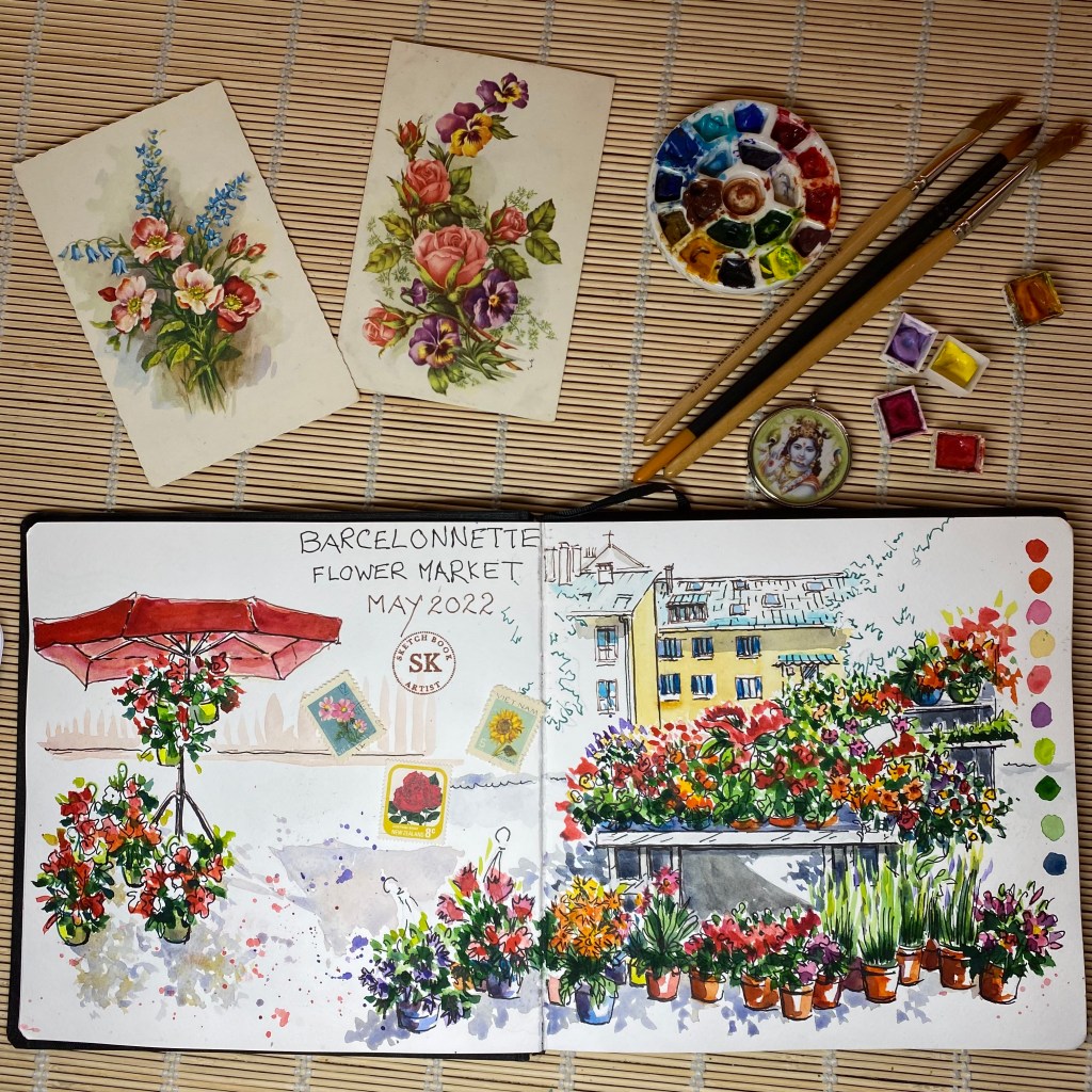 These pages were done following the yearly flower market in Barcelonnette, such a riot of colours , impossible to resist.