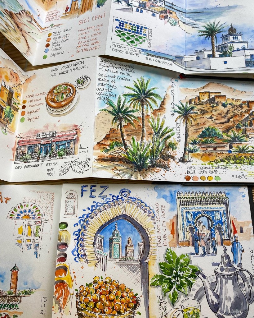 Each class takes you to a new destination with your sketchbook and I will talk you through my way of working, my inks, my colours, the way I layout my pages. You can see how I use my materials to create my pages.